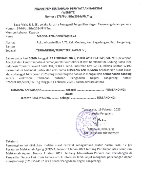 RELAAS PEMBERITAHUAN PERNYATAAN BANDING NO. 576/Pdt.Bth/2024/PN Tng (An. MAGDALENA ONGKOWIJAYA)