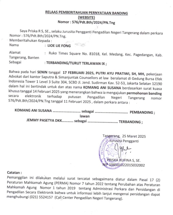 RELAAS PEMBERITAHUAN PERNYATAAN BANDING NO. 576/Pdt.Bth/2024/PN Tng (An. LIOE LIE FONG)