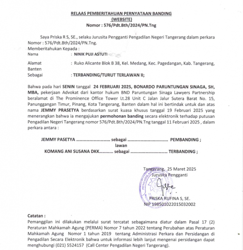 Pemberitahuan Banding, Memori Banding dan Kontra Memori Banding 576 Pdt Bth 2024 PN Tng (Pembanding II)