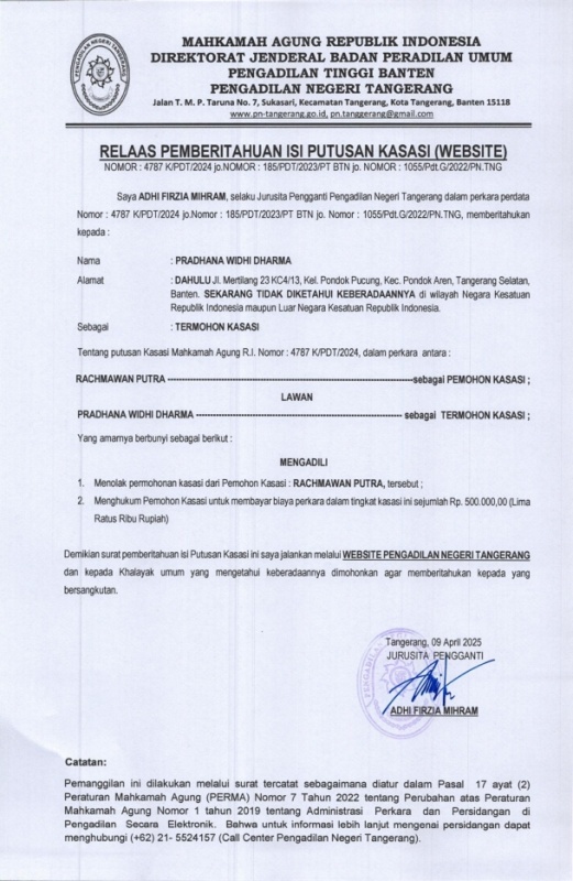 Relaas Pemberitahuan Isi Putusan Kasasi Nomor : 1055/Pdt.G/2022/PN.TNG (Website An. PRADHANA)
