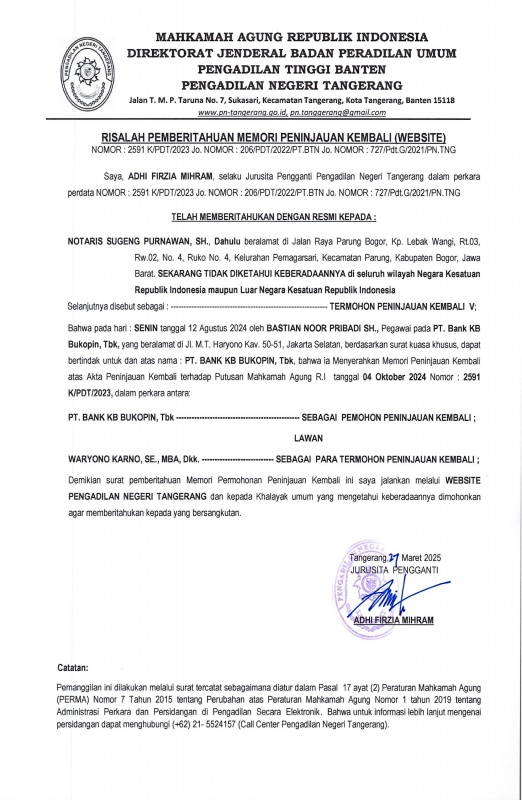 RELAAS PEMBERITAHUAN MEMORI PENINJAUAN KEMBALI PERKARA NOMOR : 727/Pdt.G/2021/PN.Tng (An. Notaris SUGENG PURNAWAN)