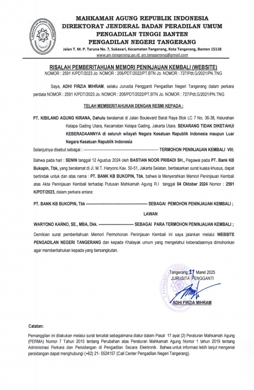 RELAAS PEMBERITAHUAN MEMORI PENINJAUAN KEMBALI PERKARA NOMOR : 727/Pdt.G/2021/PN.Tng (An. PT. KIBILAND AGUNG KIRANA)