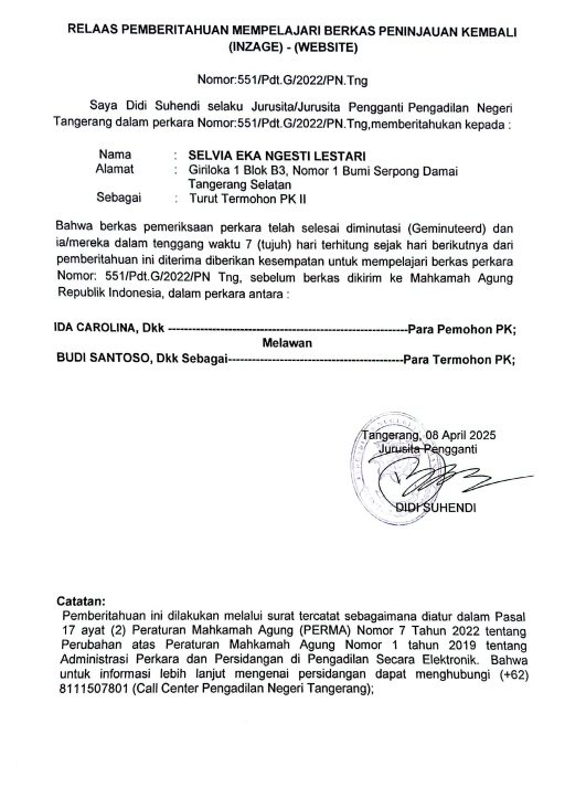 RELAAS PEMBERITAHUAN MEMPELAJARI BERKAS PENINJAUAN KEMBALI No. 551/PDT.G/2022/PN TNG (An. SELVIA EKA NGESTI LESTARI)