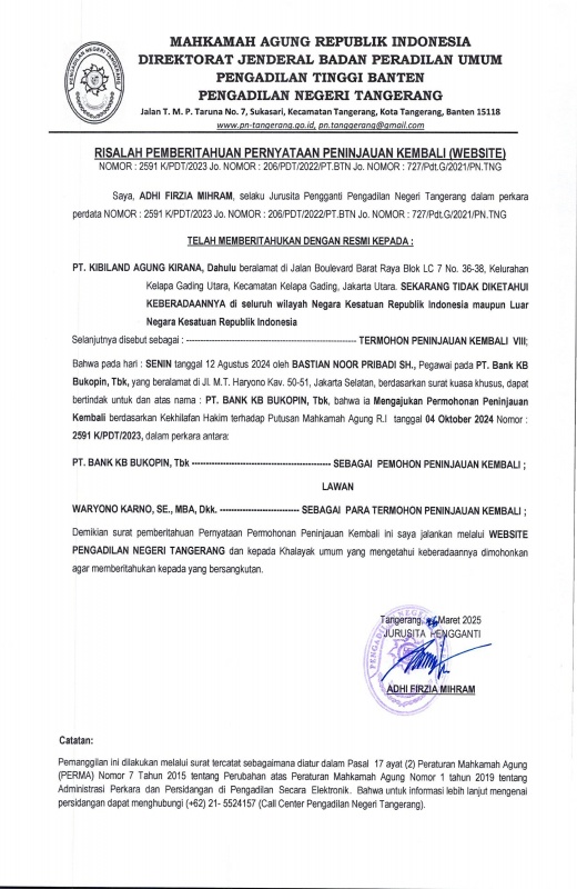 RELAAS PEMBERITAHUAN PERNYATAAN PENINJAUAN KEMBALI PERKARA NOMOR : 727/Pdt.G/2021/PN.Tng (An. PT KIBILAND AGUNG)