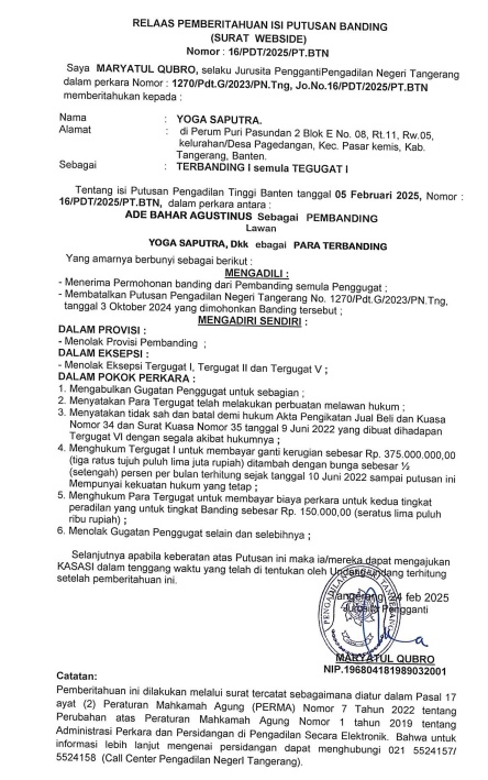 RELAAS PEMBERITAHUAN ISI PUTUSAN BANDING NO. 16/PDT/2025/PT BTN (An. YOGA SAPUTRA)