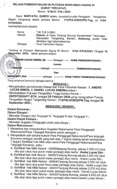 RELAAS PEMBERITAHUAN ISI PUTUSAN MA RI No. 6164 K/PDT/2024 (An. TJE TJE LIONG)