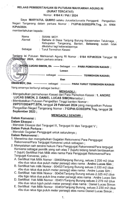 RELAAS PEMBERITAHUAN ISI PUTUSAN MA RI No. 6164 K/PDT/2024 (An. SWAN MOY)