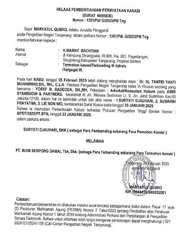 RELAAS PEMBERITAHUAN PERNYATAAN KASASI No. 1301/PDT.G/2023/PN TNG (An. H. MAMAT BACHTIAR)