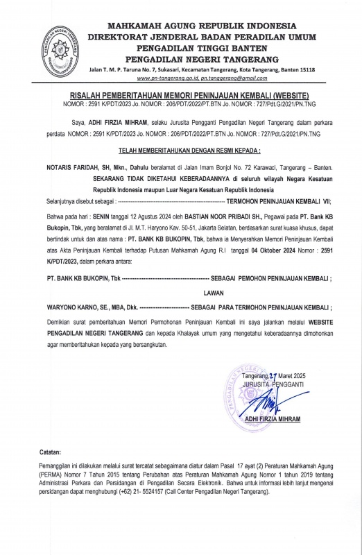 RELAAS PEMBERITAHUAN MEMORI PENINJAUAN KEMBALI PERKARA NOMOR : 727/Pdt.G/2021/PN.Tng (An. NOTARIS FARIDAH)