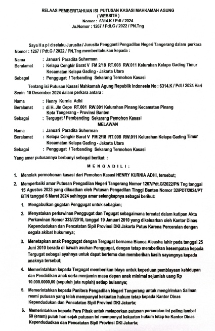 RELAAS PEMBERITAHUAN ISI PUTUSAN KASASI MAHKAMAH AGUNG No. 6314 K/Pdt/2024 Jo No. 1267/Pdt.G/2022/PN Tng (An. JANUARI PARADITA SUHERMAN)