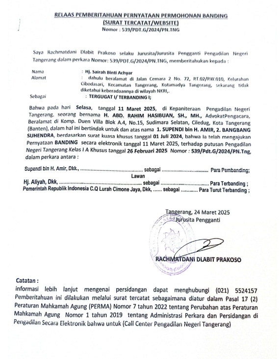 RELAAS PEMBERITAHUAN PERNYATAAN PERMOHONAN BANDING No. 539/PDT.G/2024/PN TNG (An. Hj. SAIRAH BINTI ACHYAR)