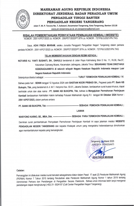 RELAAS PEMBERITAHUAN PERNYATAAN PENINJAUAN KEMBALI PERKARA NOMOR : 727/Pdt.G/2021/PN.Tng (An. Notaris Hj. YANTI SUSANTI)