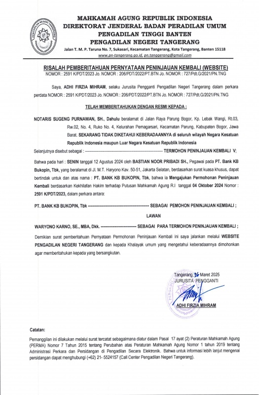 RELAAS PEMBERITAHUAN PERNYATAAN PENINJAUAN KEMBALI PERKARA NOMOR : 727/Pdt.G/2021/PN.Tng (An. NOTARIS SUGENG PURNAWAN)