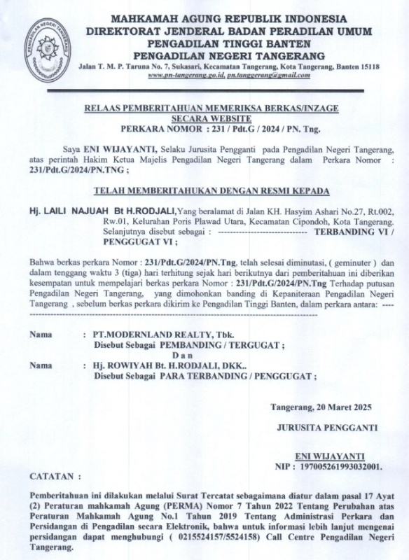 RELAAS PEMBERITAHUAN MEMERIKSA BERKAS/INZAGE SECARA WEBSITE NO: 231/PDT.G/2024/PN TNG KEPADA TERBANDING VI/PENGGUGAT VI