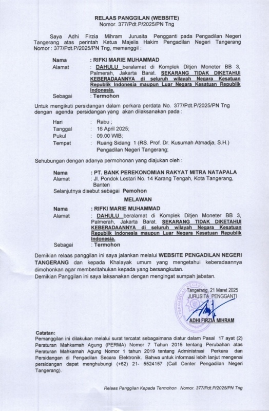 Relaas Panggilan Permohonan Nomor : 377/Pdt.P/2025/PN Tng Termohon (WEBSITE) An. RIFKI MARIE