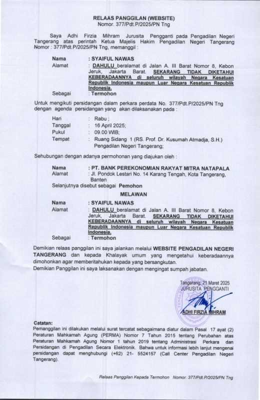 Relaas Panggilan Permohonan Nomor : 377/Pdt.P/2025/PN Tng Termohon (WEBSITE) An. SYAIFUL NAWAS