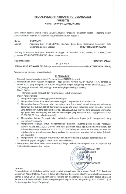 RELAAS PEMBERITAHUAN ISI PUTUSAN KASASI No. 903/PDT/2021/PN TNG (An. PURWANTI)