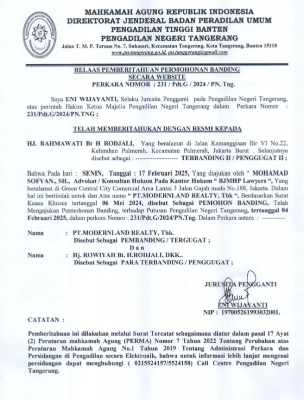 RELAAS PEMBERITAHUAN PERMOHONAN BANDING SECARA WEBSITE NO: 231/PDT.G/2024/PN TNG KEPADA TERBANDING II/TERGUGAT II