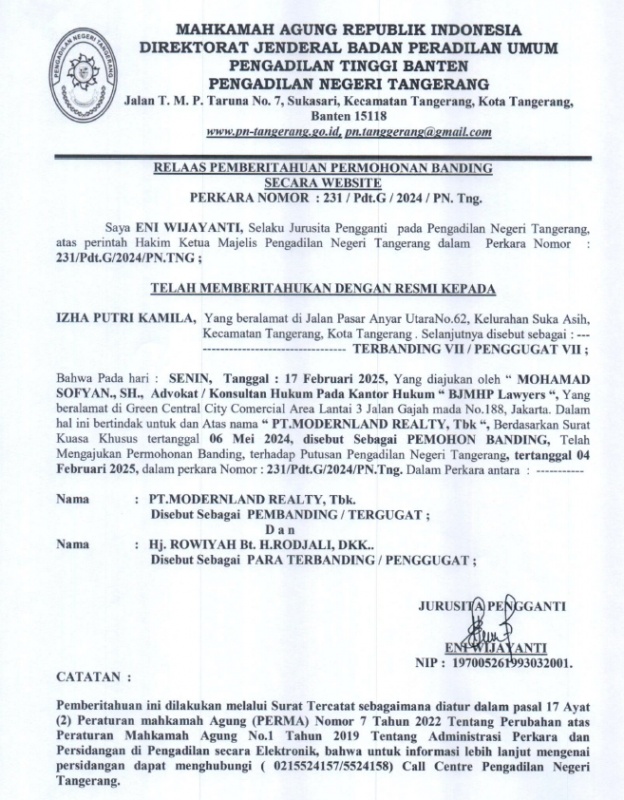 RELAAS PEMBERITAHUAN PERMOHONAN BANDING SECARA WEBSITE NO. 231/PDT.G/2024/PN TNG KEPADA TERBANDING VII/PENGGUGAT VII