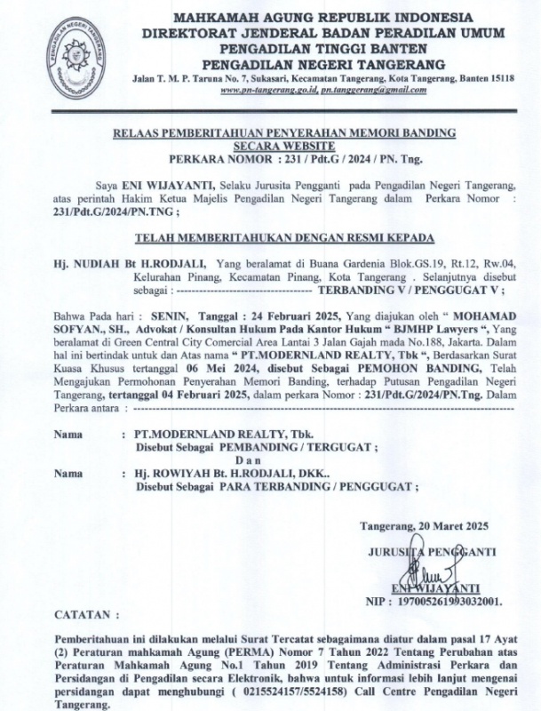 RELAAS PEMBERITAHUAN PENYERAHAN MEMORI BANDING SECARA WEBSITE NO. 231/PDT.G/2024/PN TNG KEPADA TERBANDING V/PENGGUGAT V
