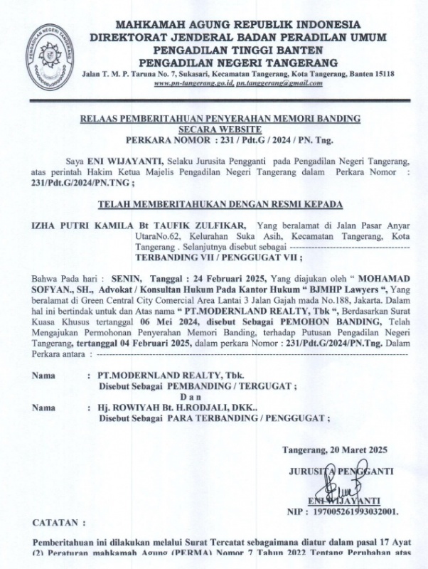 RELAAS PEMBERITAHUAN PENYERAHAN MEMORI BANDING SECARA WEBSITE NO. 231/PDT.G/2024/PN TNG KEPADA TERBANDING VII/PENGGUGAT VII