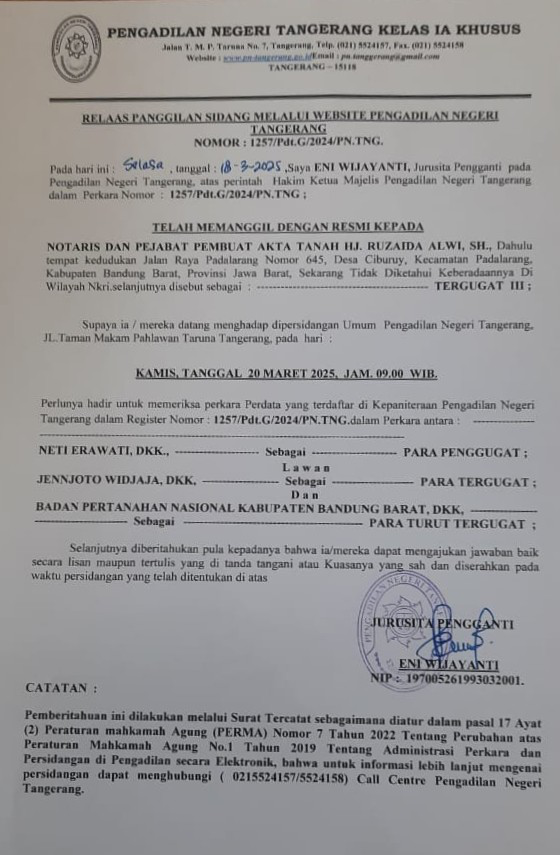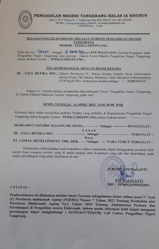 RELAAS PANGGILAN SIDANG MELALUI WEBSITE PENGADILAN NEGERI TANGERANG NO. 93/PDT.G/2025/PN TNG KEPADA TERGUGAT