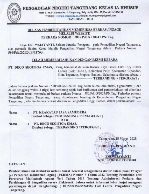 RELAAS PEMBERITAHUAN MEMERIKSA BERKAS / INZAGE No. 580/Pdt.G/2024/PN Tng (An. PT. DECO SEGITIGAS EMAS)