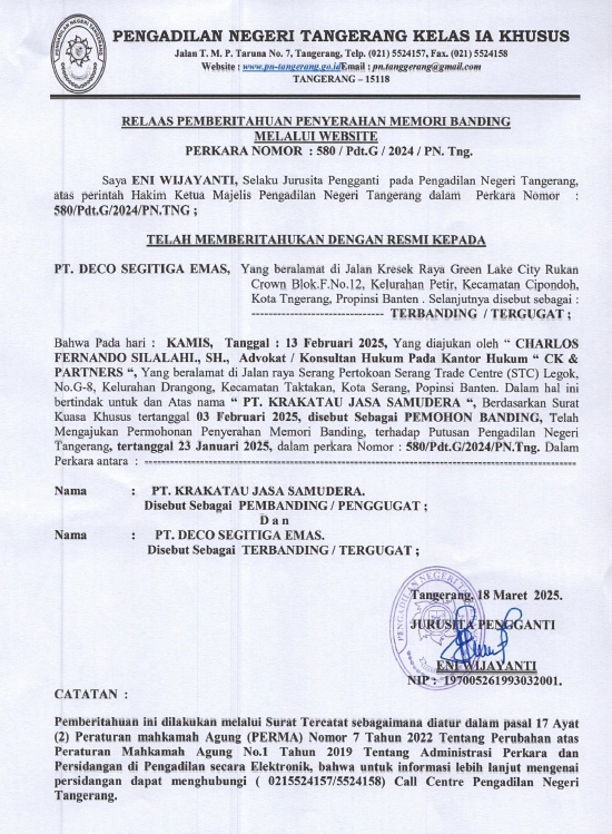 RELAAS PEMBERITAHUAN PENYERAHAN MEMORI BANDING No. 580/Pdt.G/2024/PN Tng (An. PT. DECO SEGITIGAS EMAS)