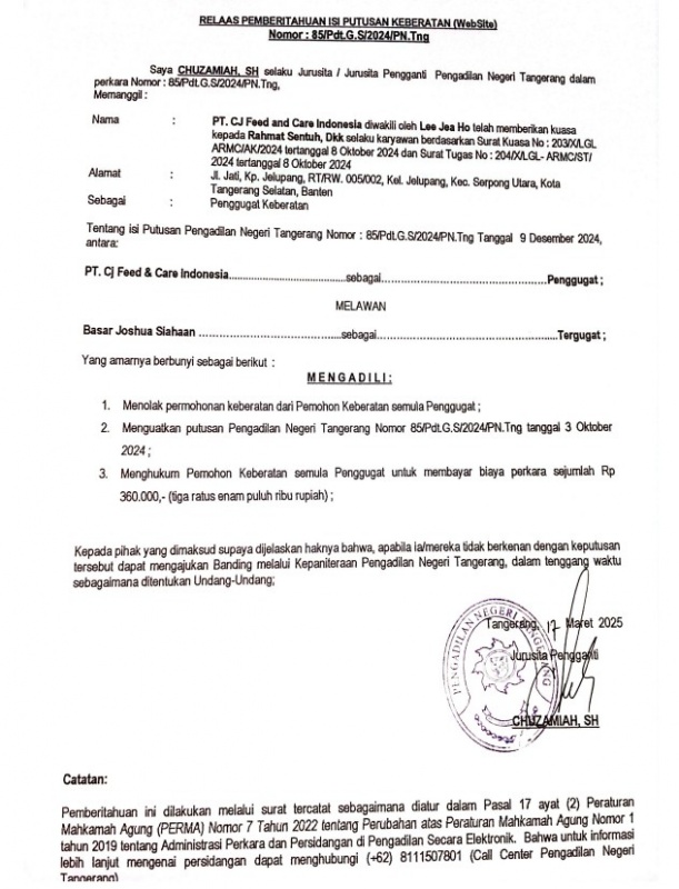 PEMBERITAHUAN ISI PUTUSAN KEBERATAN NOMOR 85/Pdt.G/2024/PN Tng
