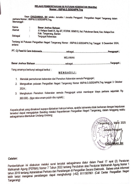 PEMBERITAHUAN ISI PUTUSAN KEBERATAN NOMOR 85/Pdt.G/2024/PN Tng KEPADA TERGUGAT KEBERATAN