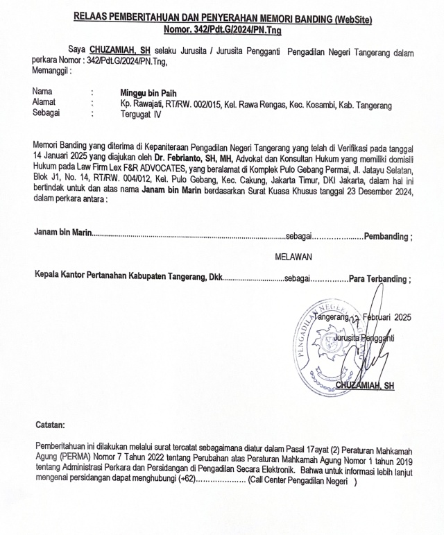 RISALAH PEMBERITAHUAN DAN PENYERAHAN MEMORI BANDING No. 342/Pdt.G/2024/PN Tng (An. MINGGU BIN PAIH)