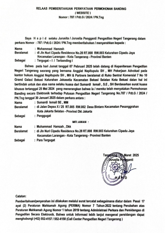 RELAAS PEMBERITAHUAN PERNYATAAN PERMOHONAN BANDING No. 787/Pdt.G/2024/PN Tng (An. MUHAMMAD HAMZAH)