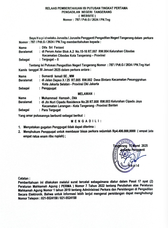 RELAAS PEMBERITAHUAN ISI PUTUSAN TINGKAT PERTAMA No. 787/Pdt.G/2024/PN Tng (An. DIFA SRI FARZANI)