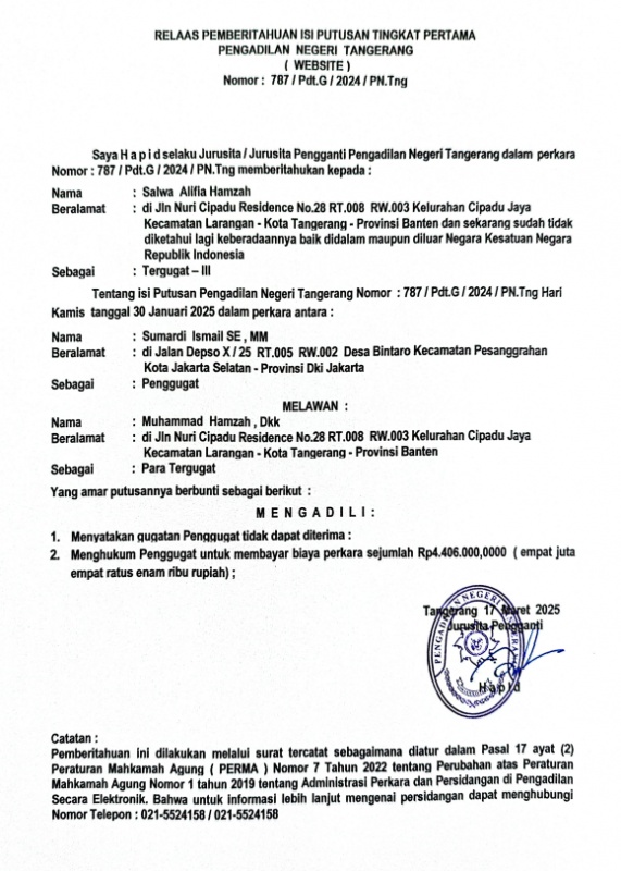 RELAAS PEMBERITAHUAN ISI PUTUSAN TINGKAT PERTAMA No. 787/Pdt.G/2024/PN Tng (An. SALWA ALIFIA HAMZAH)