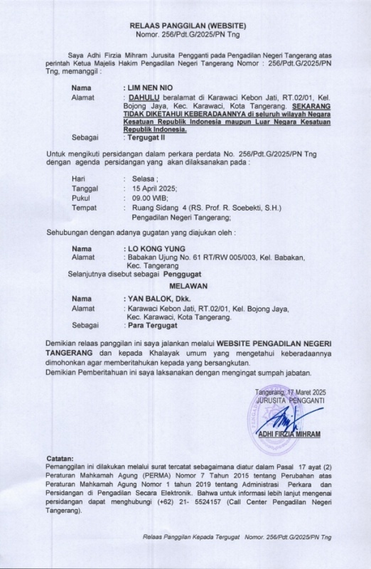 Relaas Panggilan Sidang Perkara Nomor : 256/Pdt.G/2025/PN.Tng Tergugat II (WEBSITE) An. LIM NEN NIO
