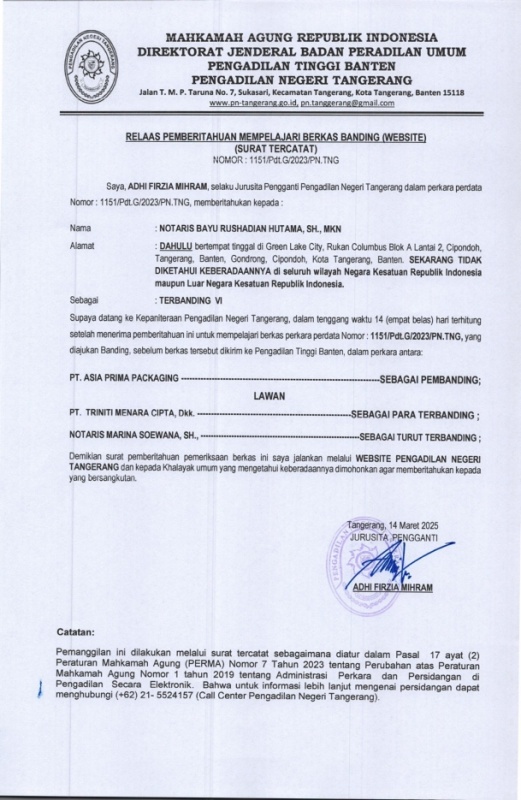 PEMBERITAHUAN INZAGE BANDING PERKARA PERDATA NOMOR 1151/Pdt.G/2023/PN Tng (AN. NOTARIS BAYU RUSHADIAN)