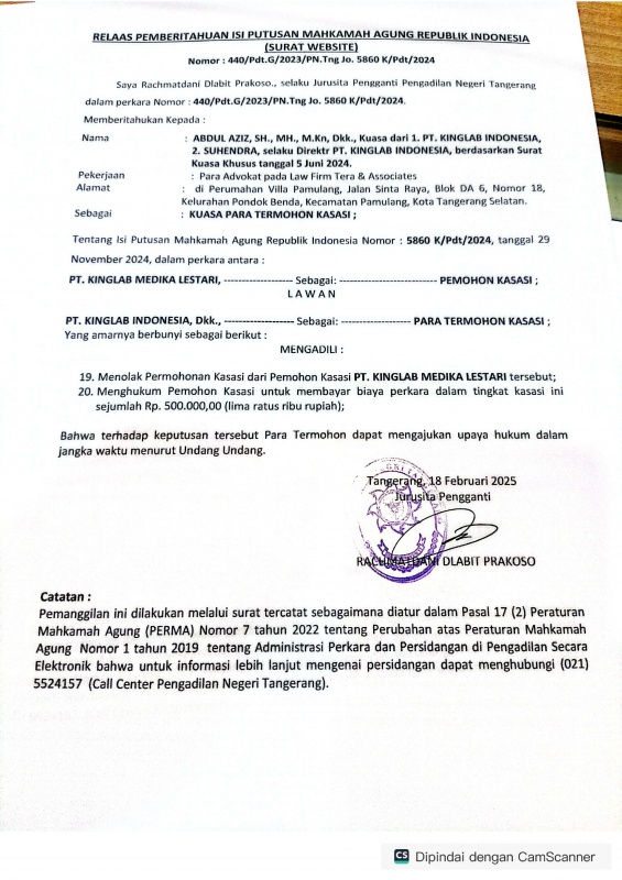 RELAAS PEMBERITAHUAN ISI PUTUSAN MA RI No. 440/Pdt.G/2023/PN Tng Jo No. 5860 K/Pdt/2024 (An. ABDUL AZIZ, Dkk selaku KUASA DARI PT. KINGLAB INDONESIA)