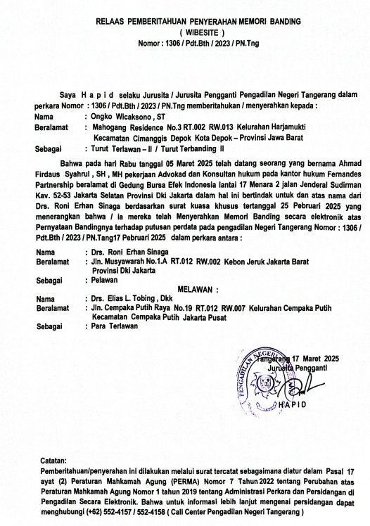 RELAAS PEMBERITAHUAN PENYERAHAN MEMORI BANDING No. 1306/Pdt.Bth/2023/PN Tng (An. ONGKO WICAKSONO, ST)