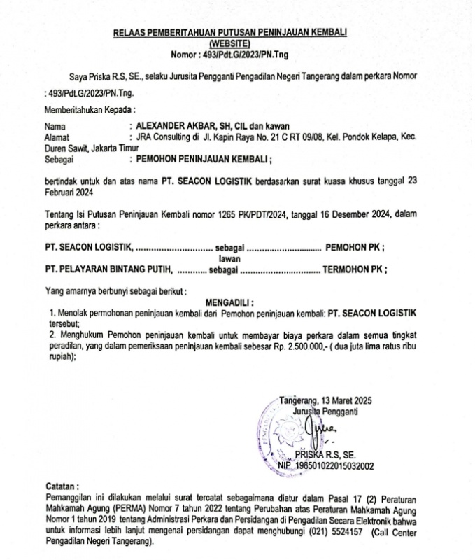 RELAAS PEMBERITAHUAN PUTUSAN PENINJAUAN KEMBALI (WEBSIE) NO. 493/PDT.G/2023/PN TNG KEPADA PEMOHON PENINJAUAN KEMBALI