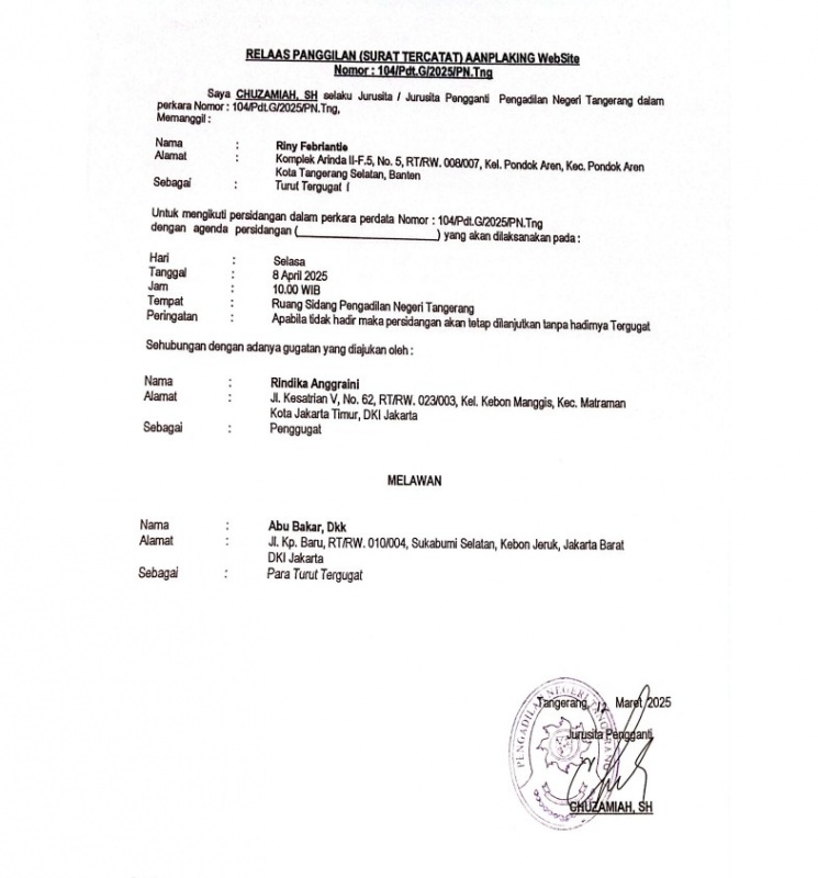 RELAAS PANGGILAN (SURAT TERCATAT) AANPLAKING NOMOR 104/Pdt.G/2025/PN Tng KEPADA TURUT TERGUGAT I