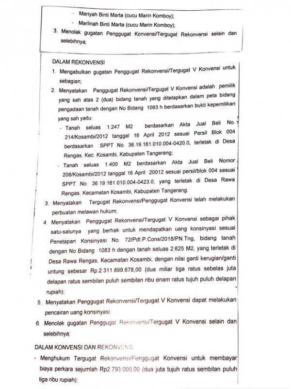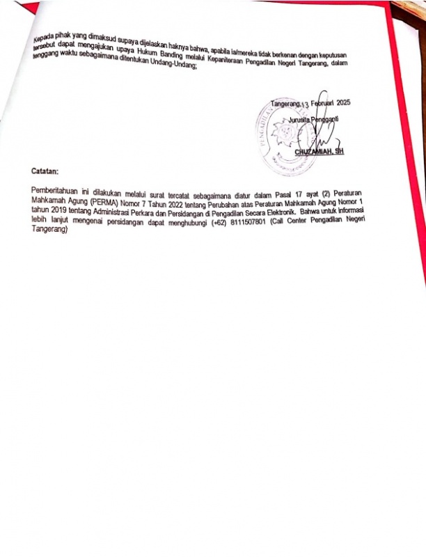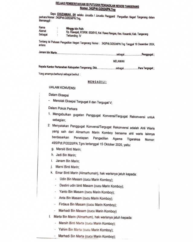 RELAAS PEMBERITAHUAN ISI PUTUSAN PN TANGERANG NOMOR 342/Pdt.G/PN Tng KEPADA TERBANDING IV