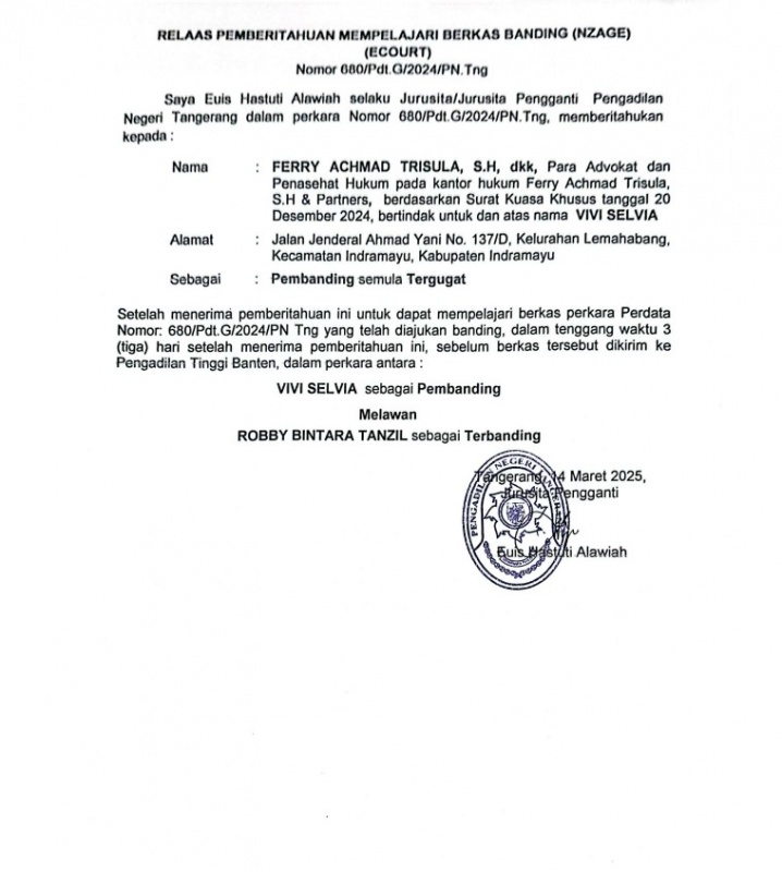 RELAAS PEMBERITAHUAN MEMPELAJARI BERKAS BANDING INZAGE NOMOR 680/Pdt.G/2024/PN Tng