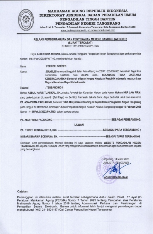 RELAAS PEMBERITAHUAN MEMORI BANDING PERKARA PERDATA NOMOR 1151/Pdt.G/2023/PN Tng (AN. FERRERI FORBES)