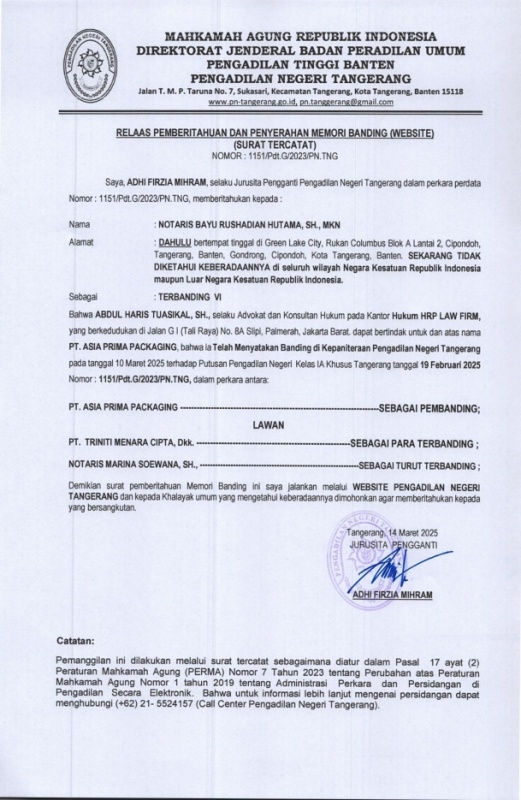 RELAAS PEMBERITAHUAN MEMORI BANDING PERKARA PERDATA NOMOR 1151/Pdt.G/2023/PN Tng (AN. NOTARIS BAYU RUSHADIAN)