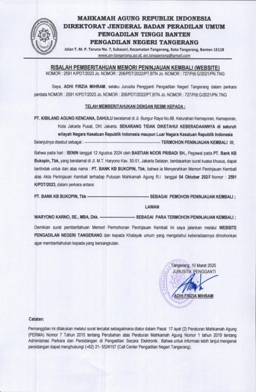 RELAAS PEMBERITAHUAN MEMORI PENINJAUAN KEMBALI NO. 727/Pdt.G/2021/PN Tng KEPADA PT. KIBILAND AGUNG KENCANA