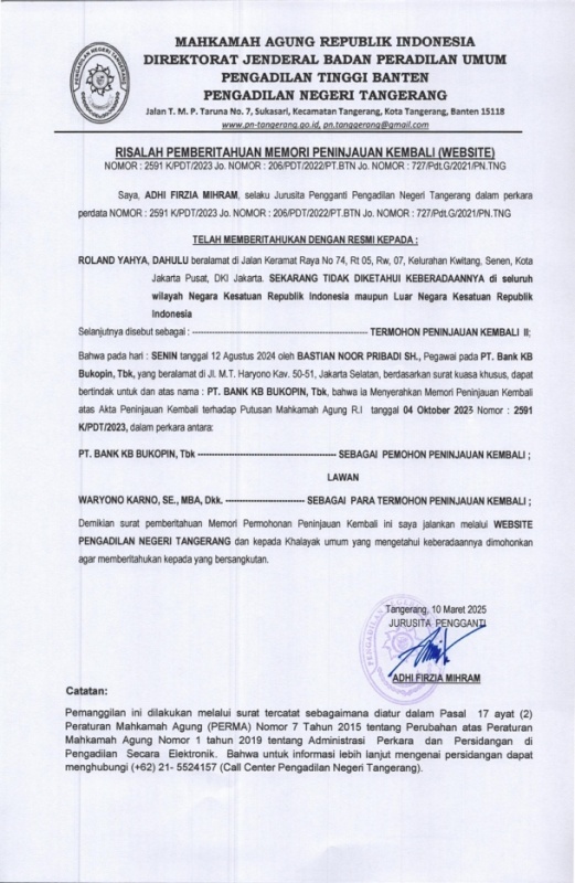 RELAAS PEMBERITAHUAN MEMORI PENINJAUAN KEMBALI NO. 727/Pdt.G/2021/PN Tng KEPADA ROLAND