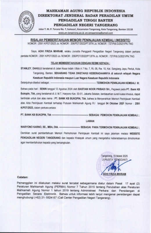 RELAAS PEMBERITAHUAN MEMORI PENINJAUAN KEMBALI NO. 727/Pdt.G/2021/PN Tng KEPADA STANLEY