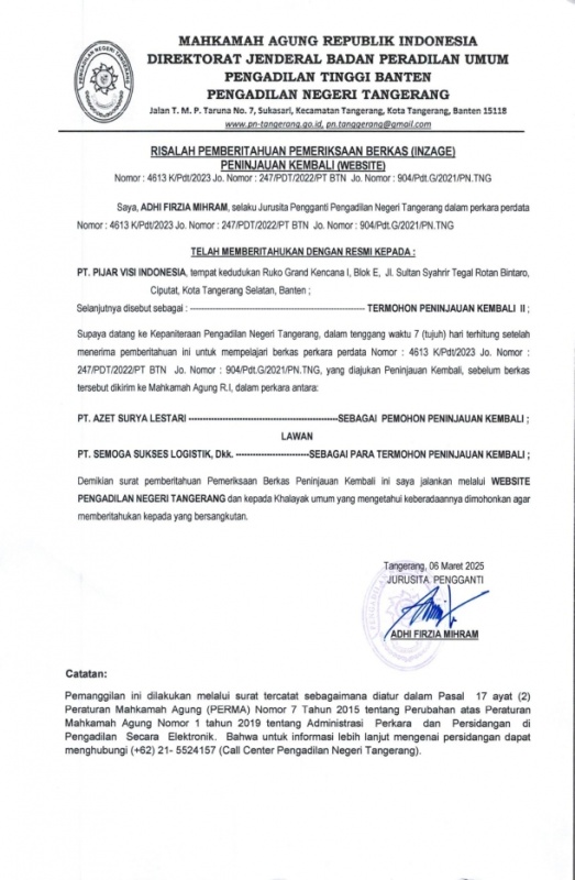 RELAAS PEMBERITAHUAN MEMERIKSA BERKAS PERKARA PK Nomor 904/Pdt.G/2021/PN.Tng (An. PT. PIJAR)