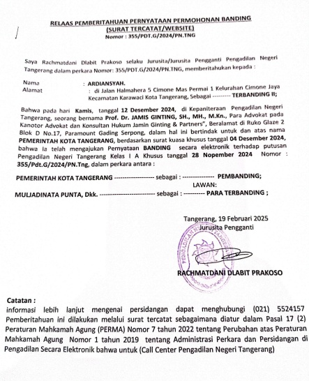 RELAAS PEMBERITAHUAN PERNYATAAN PERMOHONAN BANDING No. 355/Pdt.G/2024/PN Tng (An. ARDIANSYAH)