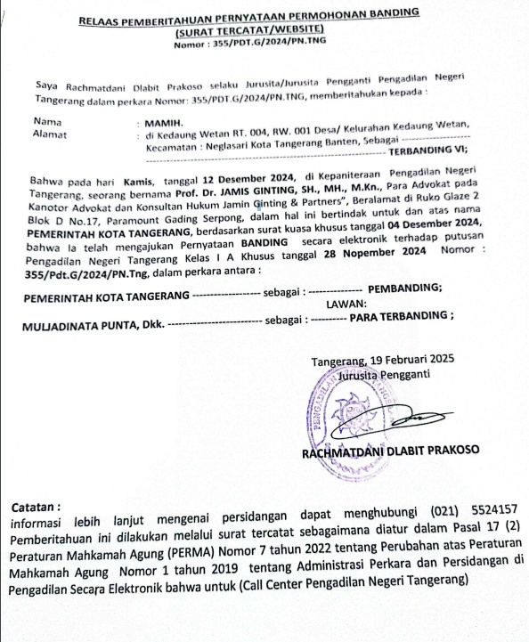 RELAAS PEMBERITAHUAN PERNYATAAN PERMOHONAN BANDING No. 355/Pdt.G/2024/PN Tng (An. MAMIH)